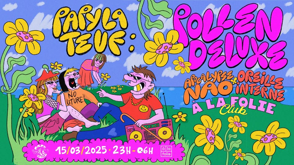 PAPY LA TEUF POLLEN DELUXE club 15.03.2025 23h/06h WARM-UP TBA (FR)APOCALYPSE NAO (FR)OREILLE INTERNE (FR)PAPY LA TEUF ( FR) Billetterie: 8-10-12-15€